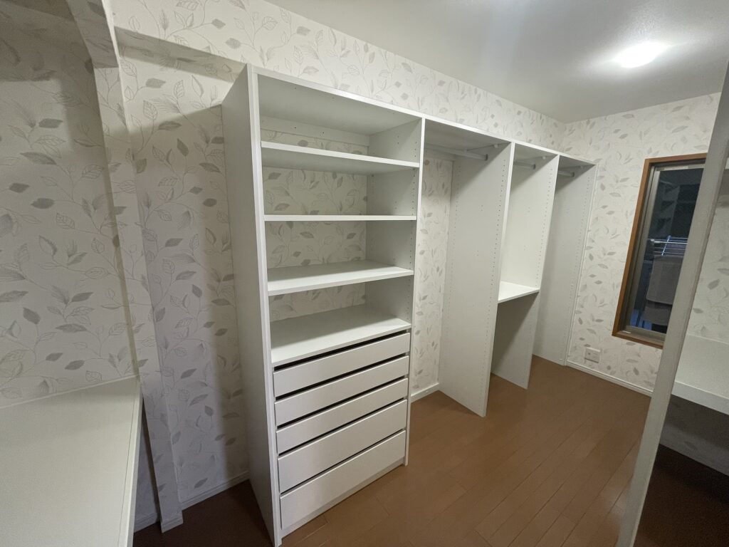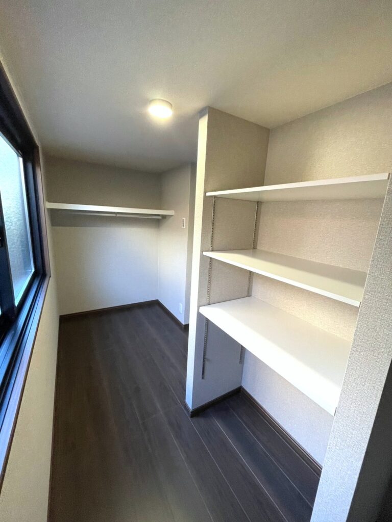 使われていなかった寝室横の1帖半のスペースを、 広いウォークインクローゼットへリフォームしました。 収納棚やハンガーポールを設置し、洋服や日用品をすっきり収納できる空間に。 UV仕様の窓ガラスを採用することで、大切な衣類の日焼けも防ぎます。
