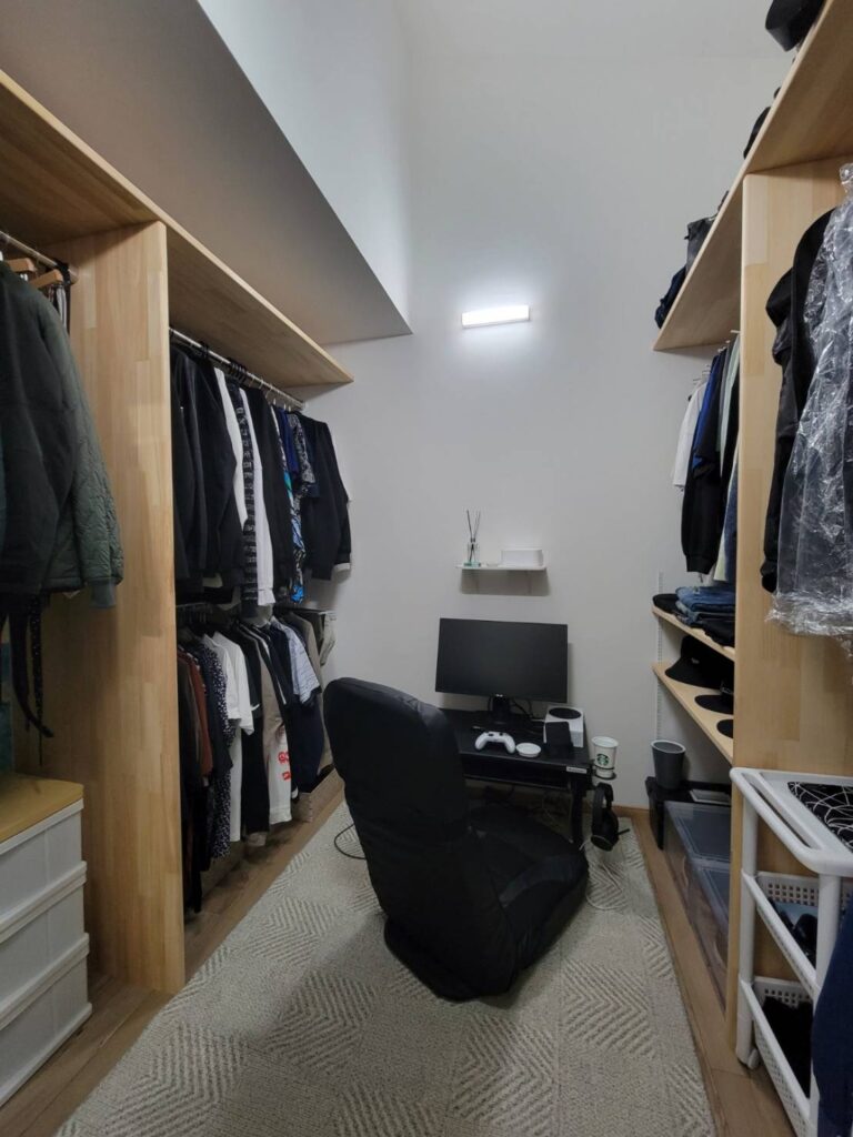 空間を活かし、約6帖の趣味部屋を設けました。 ゲームを楽しむだけでなく、 洋服好きなご主人のウォークインクローゼットも兼ねた空間です。