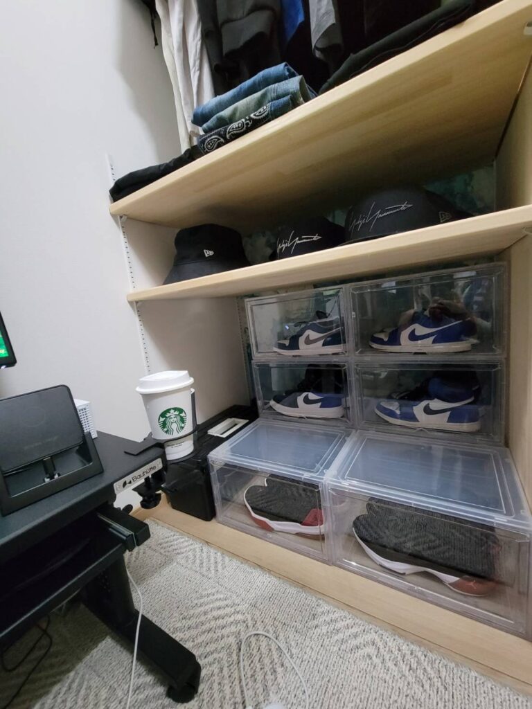 収納棚は、洋服や靴などをどこにどうしまうかを、 一緒に考えながらプランニングしました。 一部を可動棚で仕上げることで、収納ボックスもキレイに収めることができます。 収納する物やライフスタイルの変化に合わせて、フレキシブルに使えるのもポイント。 趣味と収納を両立した、自分時間を楽しめる空間です。