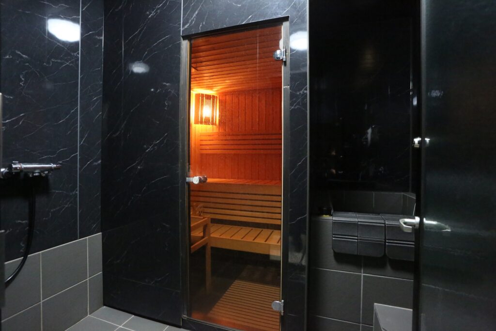 最近話題のホームサウナを導入。サウナ好きなオーナー様が、こだわって選ばれた人気の「Harvia(ハルビア)」です。2人用のゆったりとしたサイズなので、社員さんも気持ち良く汗が流せます。横に水風呂を設置するため、水漏れしないように入念な防水処理を行いました。