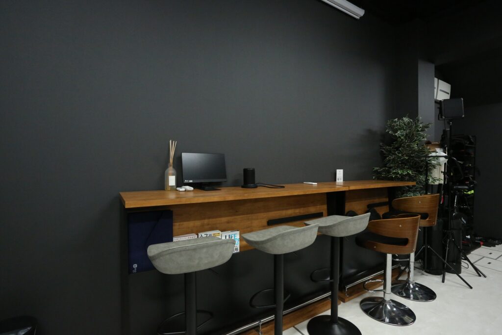 ブラックを基調とした男前な内装でまとめました。高級感のある落ち着いた雰囲気が、リラックススペースにぴったりです。天井は鉄骨を見せてかっこよく仕上げました。