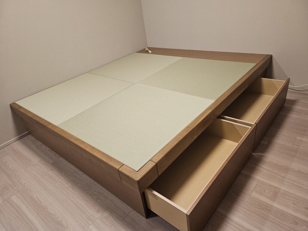 リビング横の洋室にPanasonicの「畳が丘」を設置し、くつろぎの畳スペースを作りました。大容量の収納は、日用品はもちろん、本や衣類などを整理しておくのにも便利です。引き出しタイプなので、中が見やすく出し入れもラク!大掛かりな工事をせずに、本格的な畳コーナーが1日で完成しました。