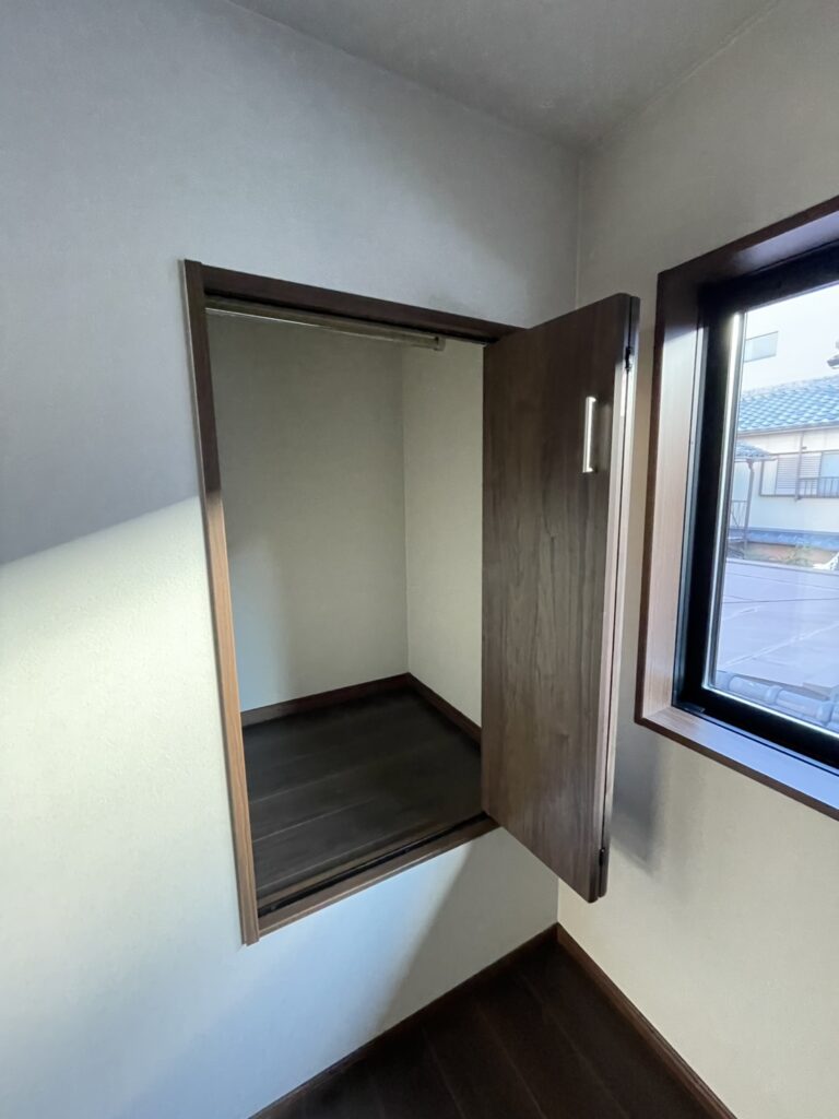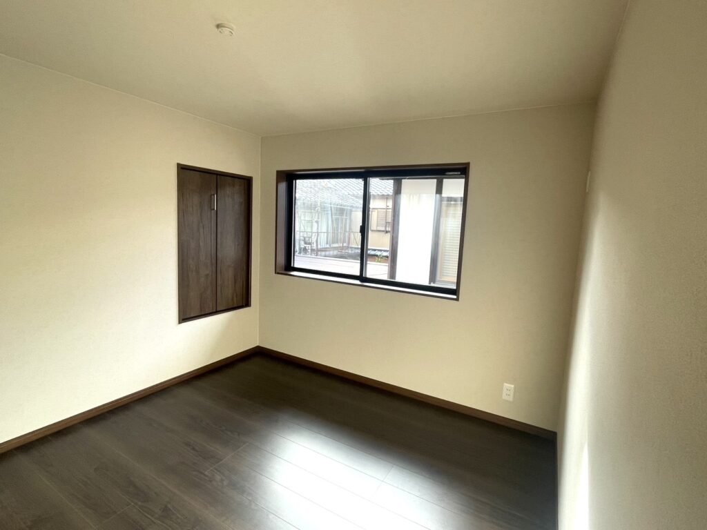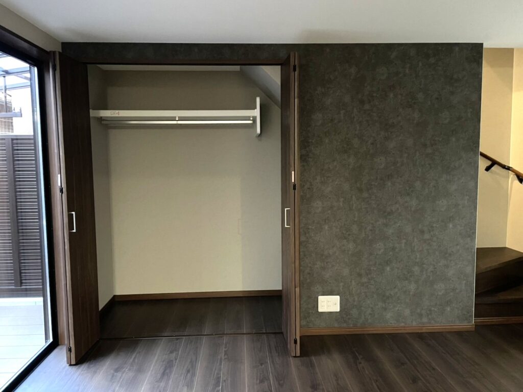 子ども部屋としても使える2階洋室は、フローリングやクロスを張り替えました。床とクローゼットの扉には深みのある色合いを選び、落ち着いた雰囲気に。クロスは主寝室と同じベージュ系で明るくすっきりとした印象に仕上げました。クローゼットはコンパクトな大きさですが、ポールを設置することで収納力はしっかり確保しています。