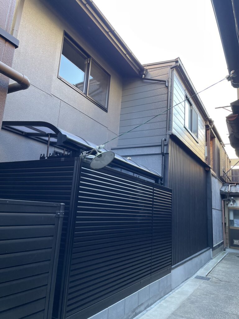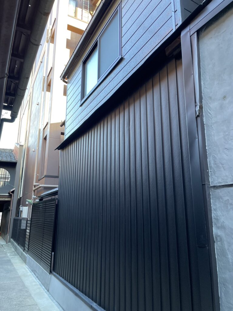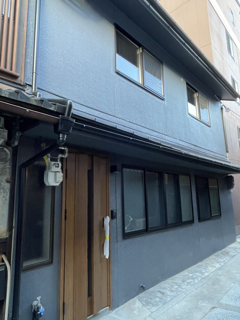 外壁も内装に合わせてスタイリッシュなデザインに仕上げました。裏手はダークグレーのサイディングを張り、左官仕上げだった玄関まわりはキレイに塗装し直しています。職人の手仕事の質感が残る、温かみが感じられる美しい外観になりました!築100年以上の建物のため、耐震性も向上。京都市のリフォーム補助金を活用し、屋根を軽量な瓦に葺き替えました。
