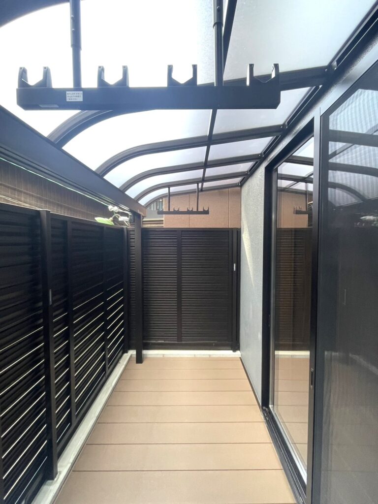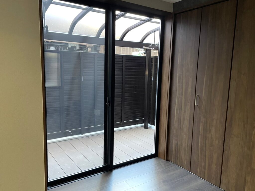 リビングの掃き出し窓の外に、洗濯物干しやアウトドア空間として活用できるウッドデッキを設置しました。フェンスで囲んでいるため視線が入らず、プライバシーが守られます。コンパクトながらもお庭スペースがあることで広がりが生まれ、室内がより開放的に。洗面所からも近い間取りのため、家事動線もスムーズ。使い勝手の良い屋外空間です。