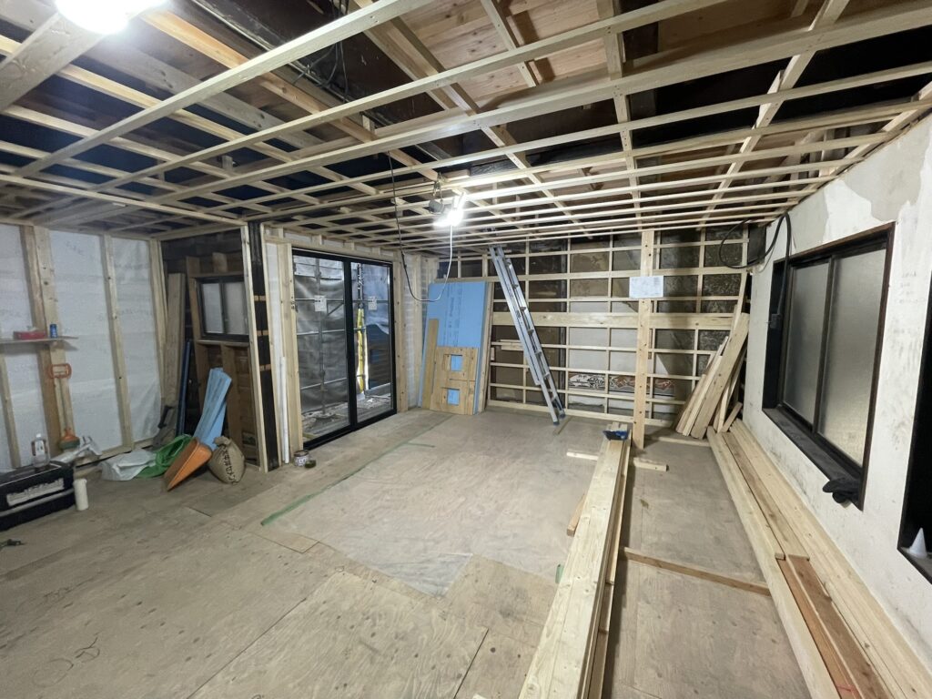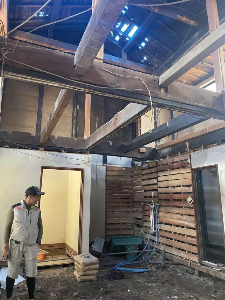 躯体と土台のみを残した大規模リノベーション。壁や床、天井を撤去すると、立派な梁が姿を現しました。新しい下地に張り替えることで、見た目の美しさはもちろん、断熱性や強度、安全性などの建物の機能性も向上しています。