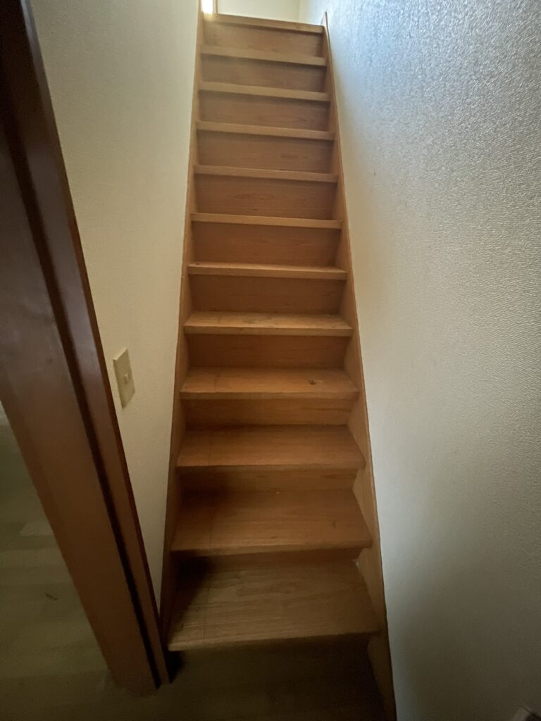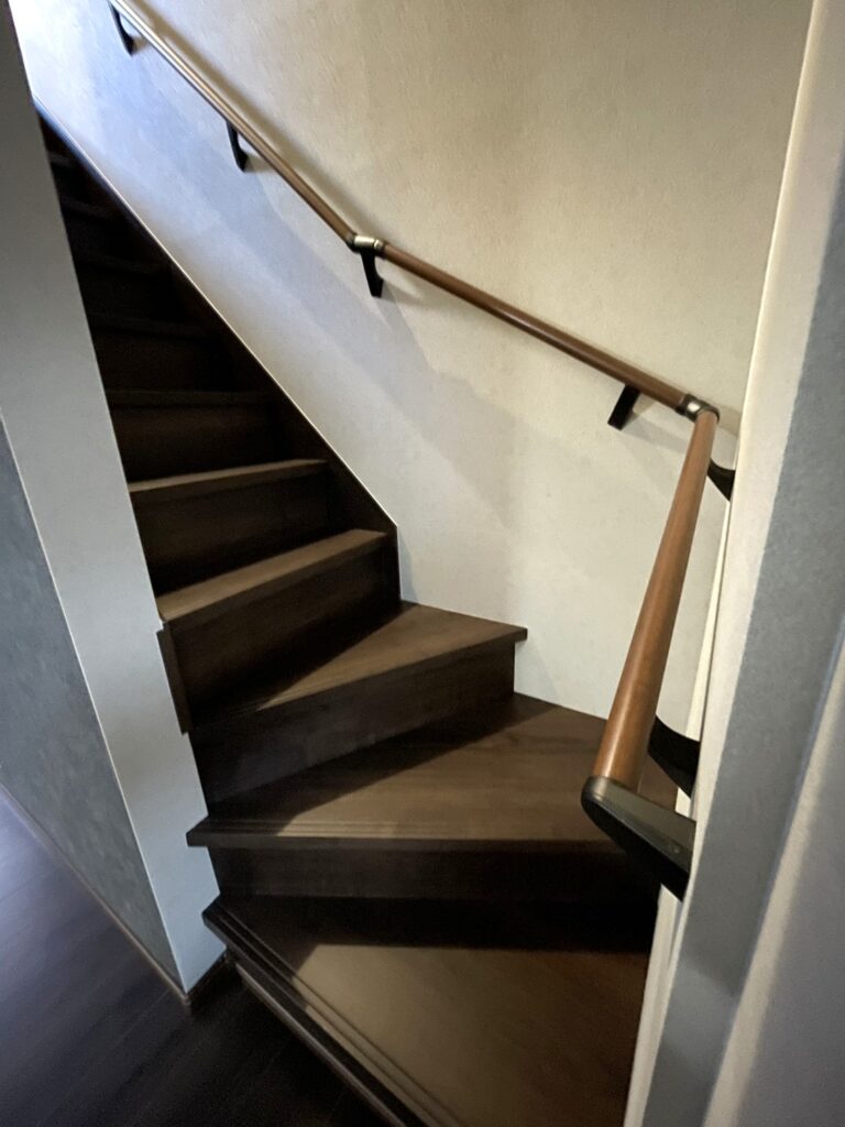 古い建物のため階段は急勾配で手すりがなく、上り下りが危険でした。そこで、1段目をリビング側に向けて設置し、段数を増やしました。手すりも増設し、階段の踏み外しや転倒を防いでくれます。安心して歩行ができる階段になりました。