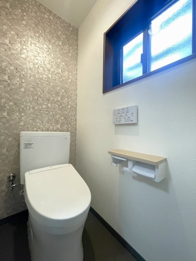 上品なクロスを選んだ落ち着いた雰囲気のトイレ空間。日常のお手入れのしやすさはもちろん、長期的なメンテナンス性も考えて「TOTO」のタンクありトイレを採用しました。TOTOのトイレは、汚れが付きにくく掃除がしやすい点で人気が高く、日々の家事負担を軽減してくれます。また、タンクありトイレであれば、ウォシュレットなど一部が故障した場合も部分的な修理が可能。将来的なリフォーム費用を抑えやすいのもメリットです。この先の暮らしまで見据えて設備を選びました。
