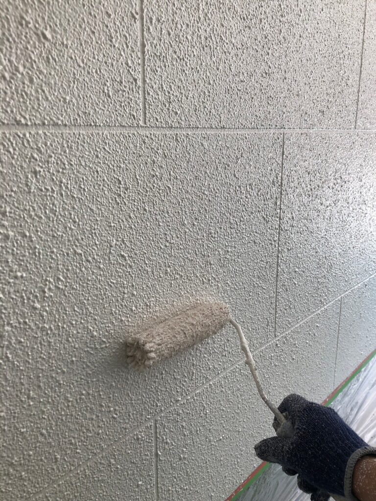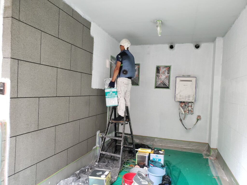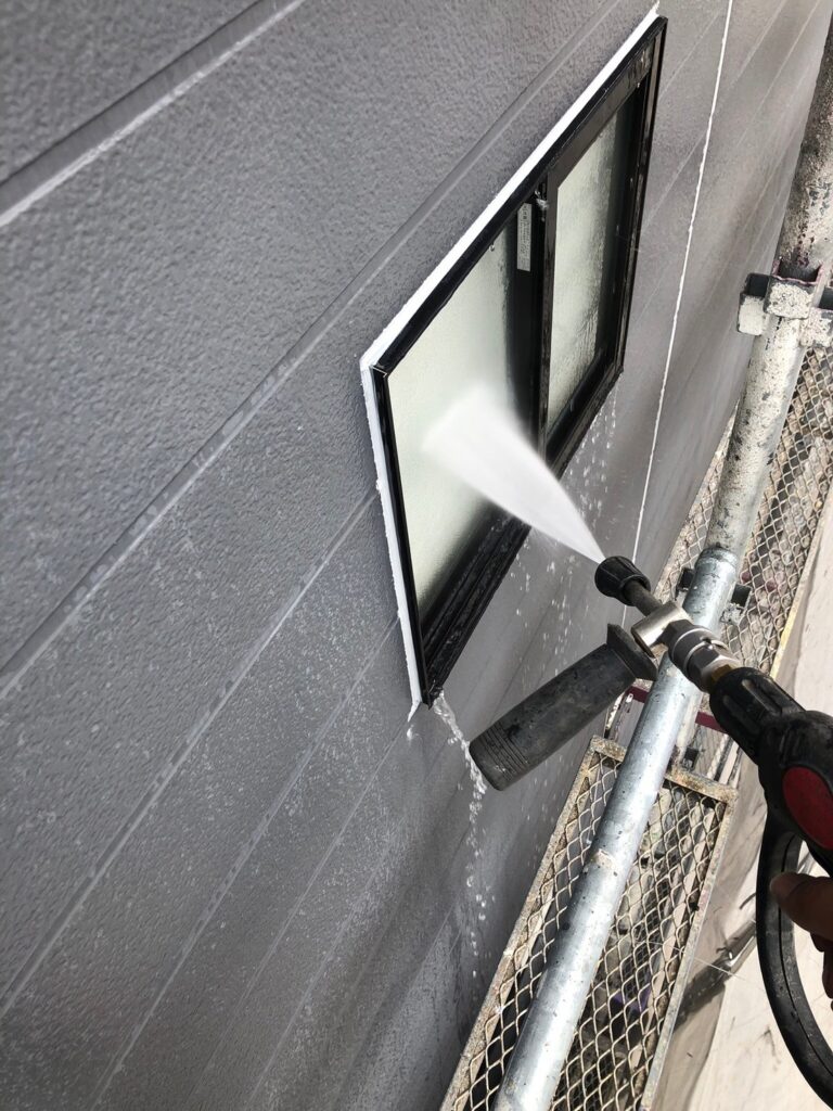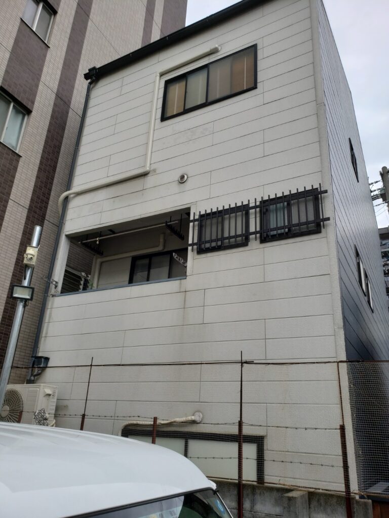 正面のモルタル調の外壁には経年によるひび割れが見られ、背面には雨垂れによって所々黒ずみもありました。まずは高圧洗浄で外壁全体の汚れをしっかり落とし、補修と塗装を行っています。正面は明るく清潔感のある白に、側面はワントーン明るいライトグレーに、背面は白で仕上げました。劣化していたコーキングも打ち替え、建物全体に統一感のある落ち着いた印象になりました。