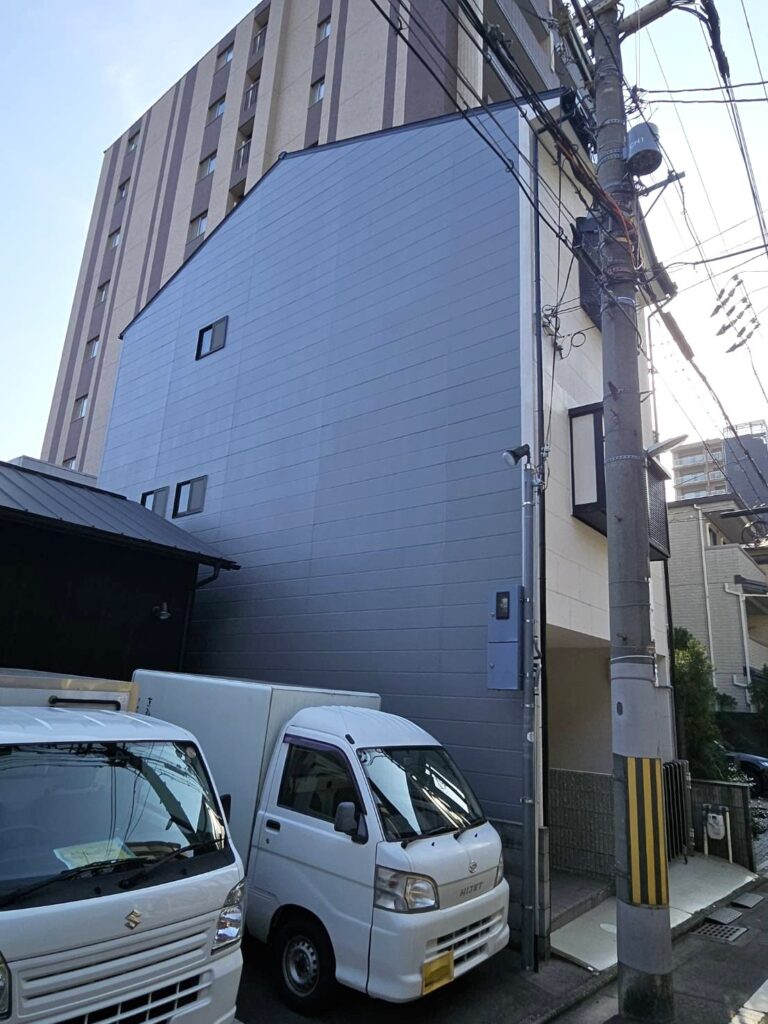 外壁は、正面はモルタル調仕上げ、側面・背面はサイディングと、面によって素材や色が異なる個性的なデザインでした。S様から「明るくキレイな外観にしたい」というご要望をいただき、メンテナンスと同時に配色を見直し、建物全体がすっきりとした印象になるよう、落ち着いた色合いへと整えました。